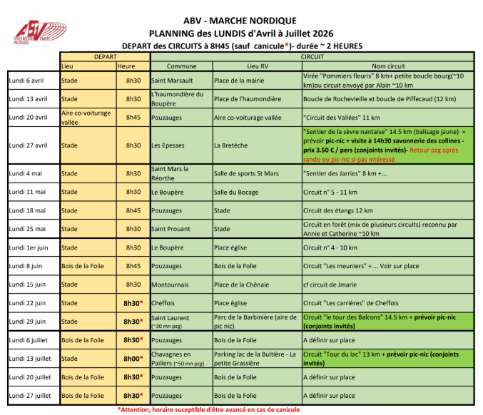 Marche nordique - Planning du lundi