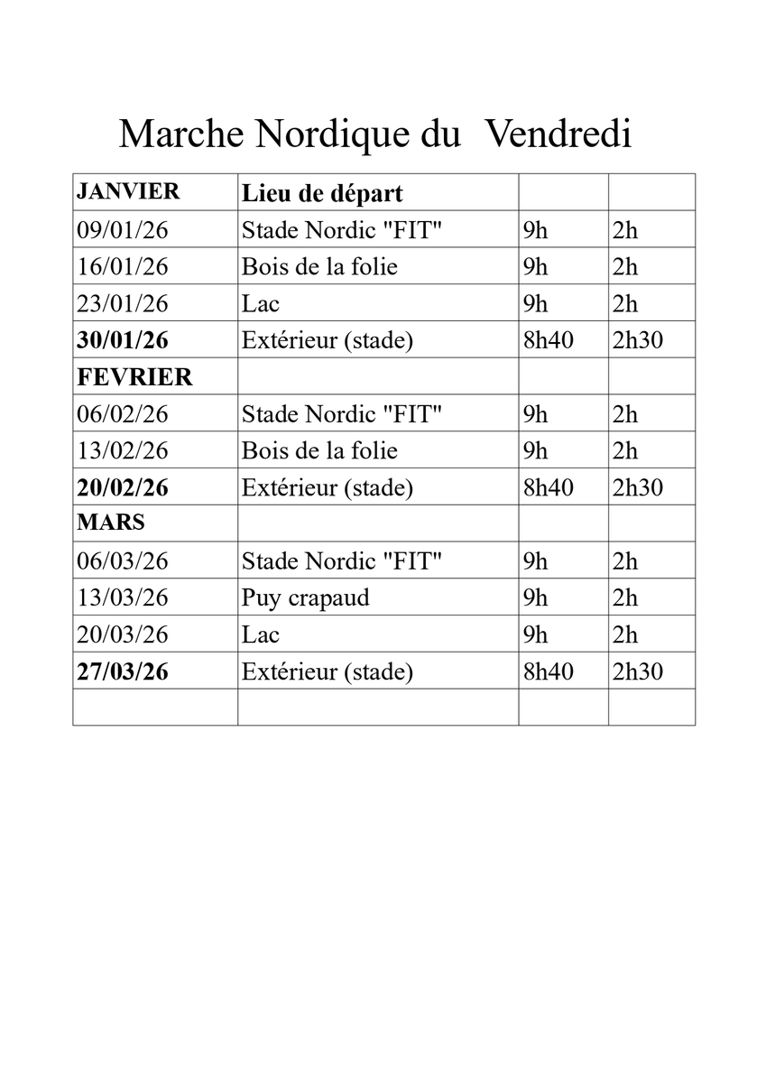 Marche Nordique - Planning du vendredi